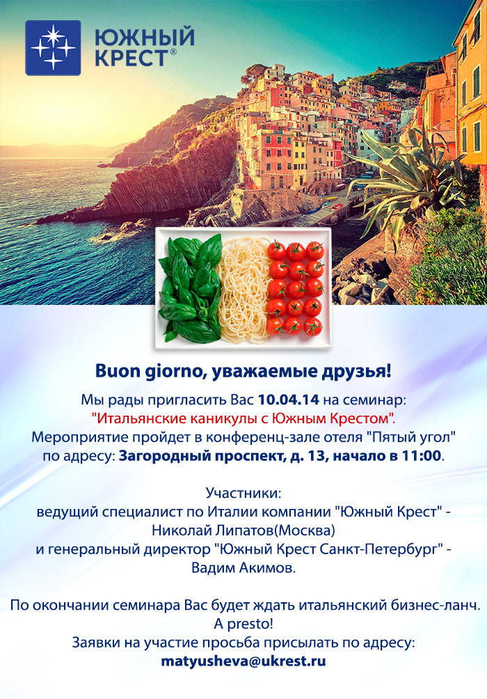 02 Апр 2014 23:31:41 СЕМИНАР 10.04 ИТАЛИЯ - туры на сезон, и бизнес-ланч - от фирмы ЮЖНЫЙ КРЕСТ