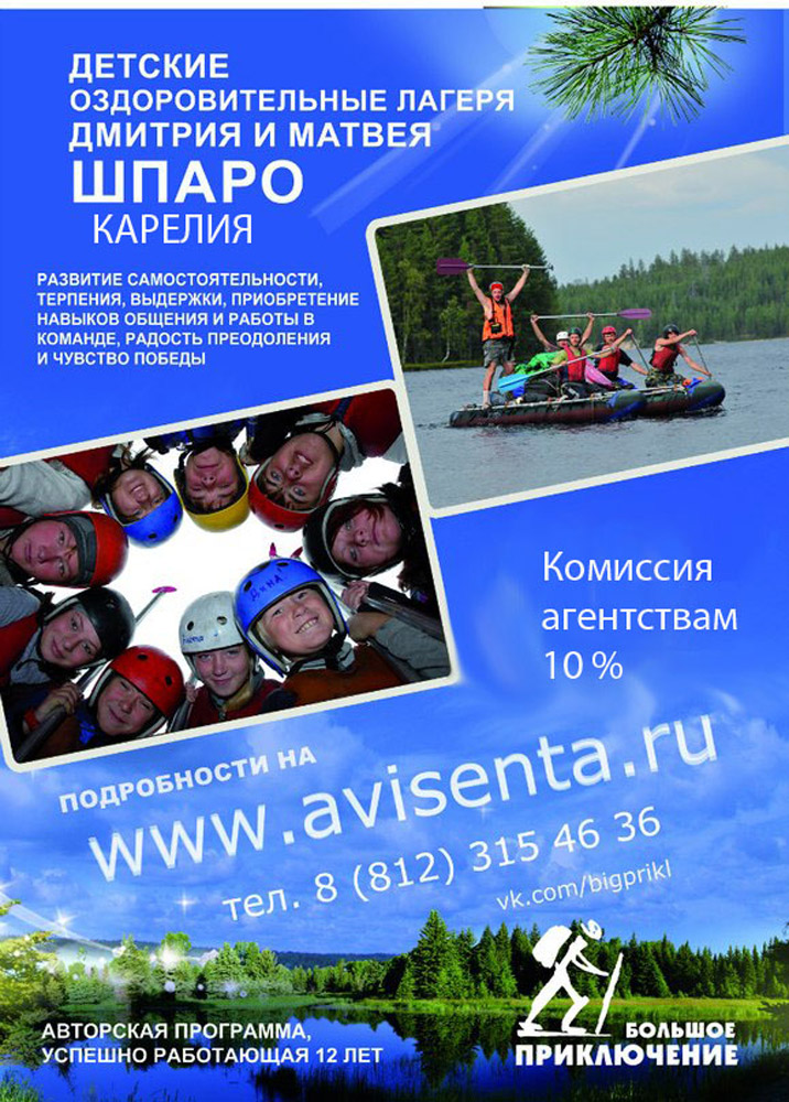 РОССИЯ Карелия ДЕТЯМ Оздоров. Лагеря "Большое приключение" (Шпаро) от фирмы АВИСЕНТА |
