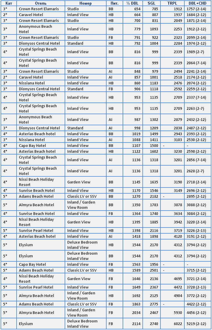 920 евро; «Гавайи» 1020 евро; «Персефона» 1060 евро; «Артемида»