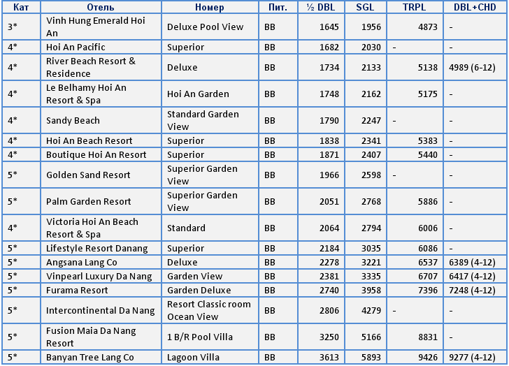 авиакомпании); - Проживание и питание в выбранном отеле в Дананге; -