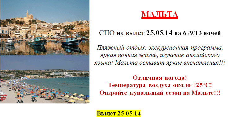 МАЛЬТА СПО на 25.05 на 6 /9/13 ночей от фирмы ИВОЛГА |