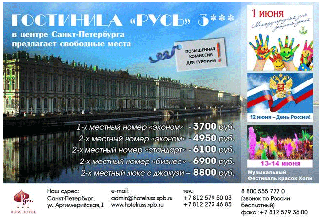 admin@hotelruss.spb.ru             тел. (812) 579-5003, 8 800 555 777     www.hotelruss.spb.ru