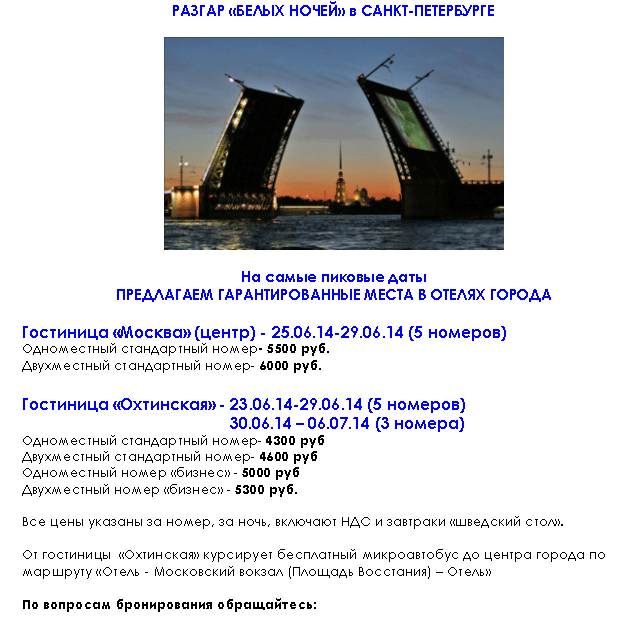 РОССИЯ - СПб размещение в гост. "Москва" с 25.06, "Охтинская" с 23.06, 30.06 от фирмы SERVICE BUREAU |