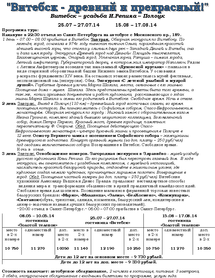 19 Июн 2014 10:14:39 БЕЛОРУССИЯ 25.07-27.07, 15.08-17.08 Витебск-усадьба И.Репина-Полоцк от фирмы АКВАРЕЛЬ