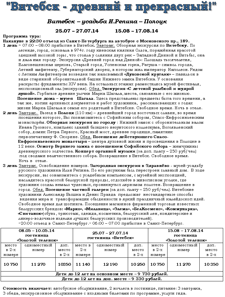 БЕЛОРУССИЯ Витебск-усадьба Репина-Полоцк, 25.07-27.07, 15.08-17.08 от фирмы АКВАРЕЛЬ |