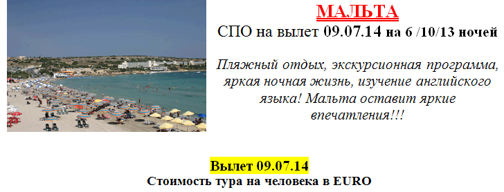 МАЛЬТА СПО на 09.07 на 6 /10/13 ночей от фирмы ИВОЛГА |