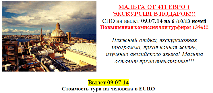 МАЛЬТА - СПО на 09.07.14 на 6 /10/13 ночей от фирмы ИВОЛГА |