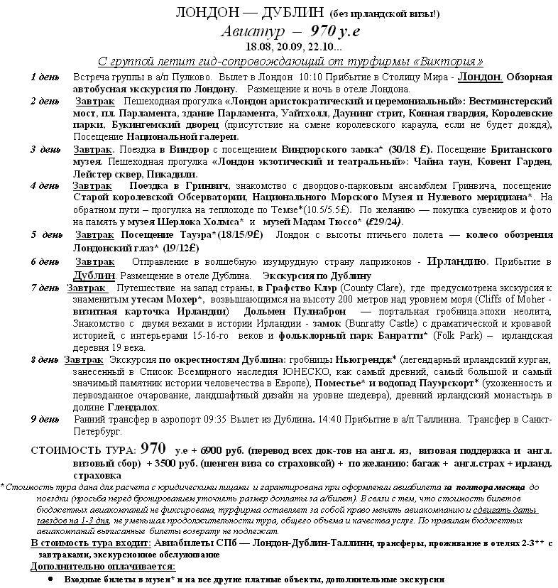 11 Июл 2014 17:59:32 ВЕЛИКОБРИТАНИЯ Лондон-Дублин 18.08 на 9д от 970 евро от фирмы ВИКТОРИЯ