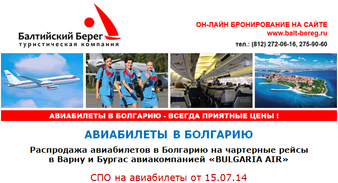 15 Июл 2014 12:08:00 БОЛГАРИЯ - Авиабилеты в Варну и Бургас от 60 евро от фирмы БАЛТИЙСКИЙ БЕРЕГ