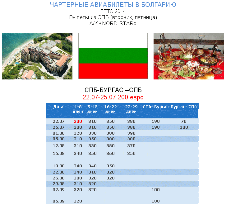 16 Июл 2014 13:11:31 БОЛГАРИЯ авиабилеты СПб-Бургас-СПб по вт. и пт. на ЛЕТО (чартер Nord Star) от фирмы КАПРИКОН