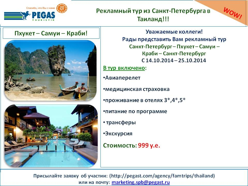 28 Июл 2014 10:17:55 ТАИЛАНД 14.10-25.10 Рекламный Тур Пухкет-Самуи-Краби за $999 от фирмы PEGAS