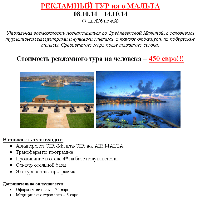 МАЛЬТА 08.10-14.10 Рекламный Тур за 450 евро от фирмы ИВОЛГА
