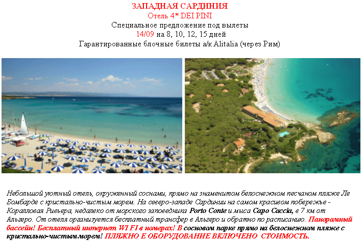 ИТАЛИЯ Сардиния отель Del Pini 4* 14.09 на 8/10/12/15д от фирмы АРТ-ТРЕВЕЛ |