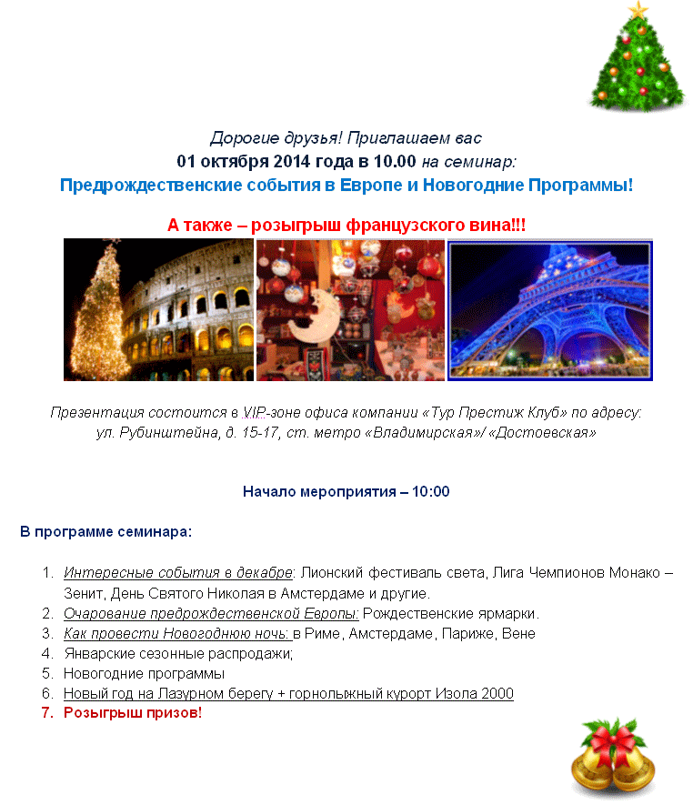 СЕМИНАР 01.10 ЕВРОПА в Декабре - события, ярмарки, распрод., - и розыгрыш призов от фирмы ТУР ПРЕСТИЖ |