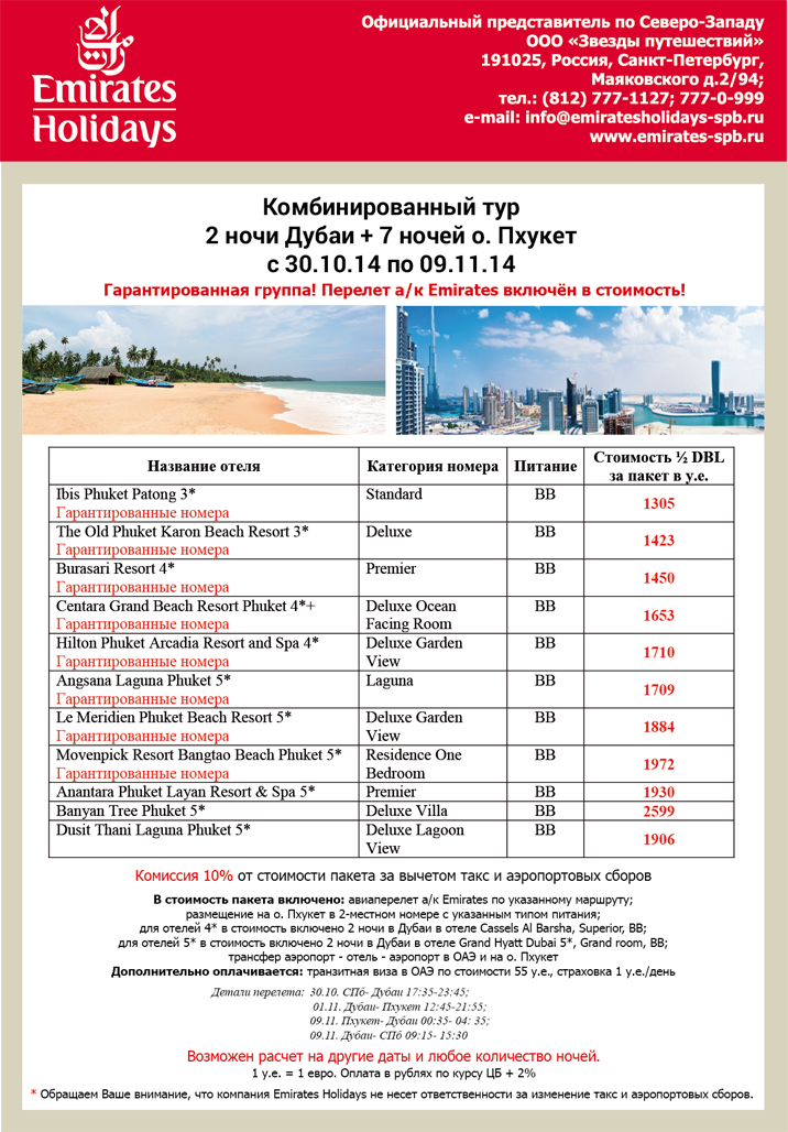 ОАЭ+ТАИЛАНД 30.10-09.11 Дубаи (2н.) + Пхукет (7н.), гарант. группа от фирмы EMIRATES HOLIDAYS
