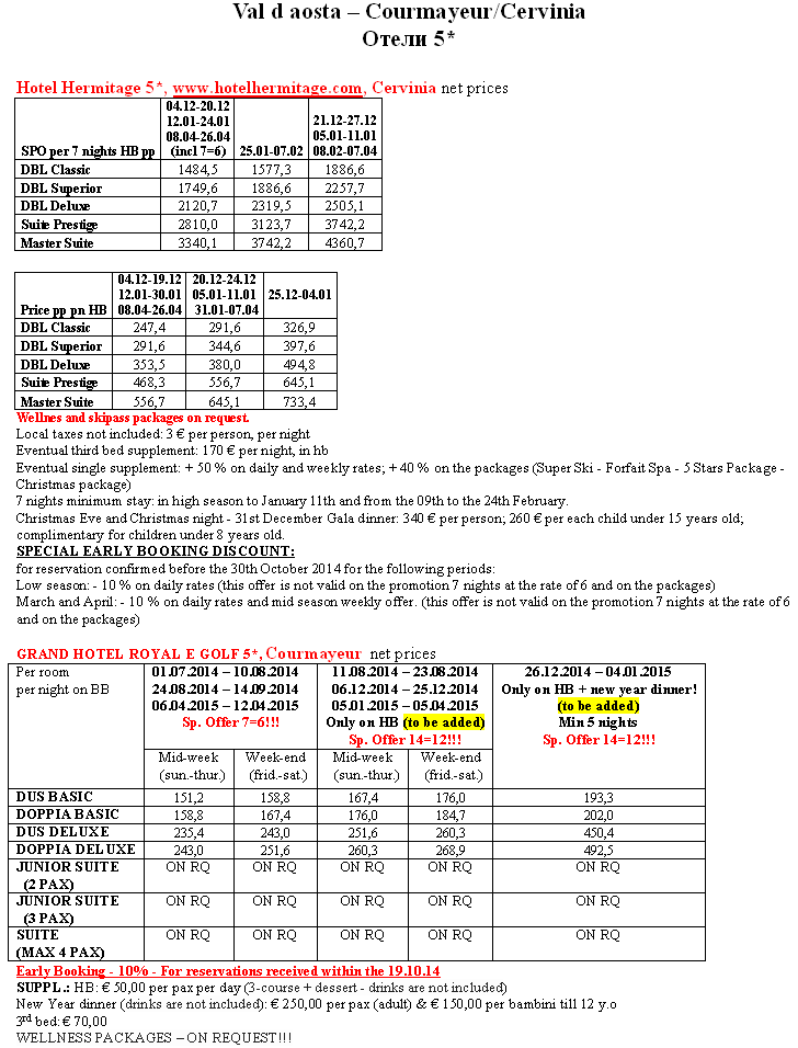 07 Ноя 2014 14:38:02 ИТАЛИЯ Червиния Val d Aosra - отели 5* от фирмы MKT VIAGGI