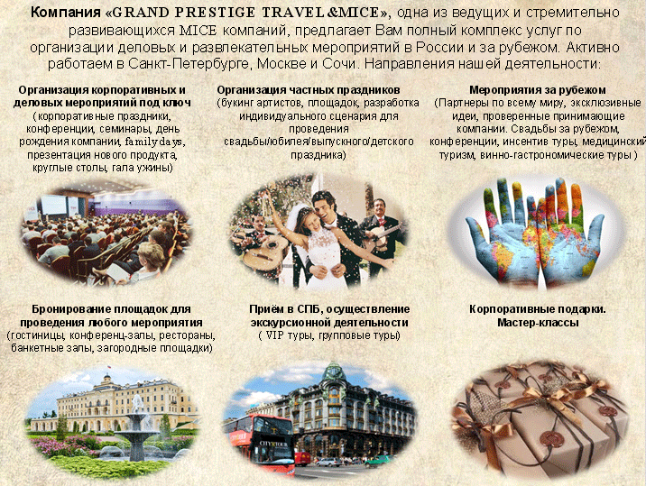 Команда GRAND PRESTIGE TRAVEL & MICE готова организовать для Вас любой тип делового и корпоративного мероприятия "под ключ". Наша креативная команда предложит Вам только эксклюзивные сценарии организации мероприятия, проверенные площадки и лучших артистов, мы можем открыть для Вас двери любой площадки, дополнить деловое мероприятие интересными мастер-классами, дегустациями.