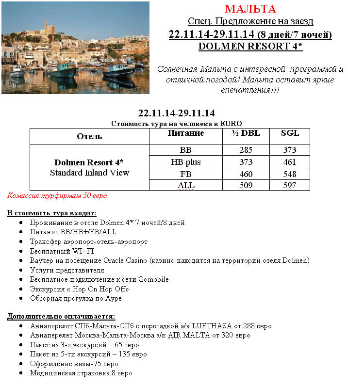 12 Ноя 2014 10:26:44 МАЛЬТА 22.11-29.11 Dolmen Resort 4* от 285 евро + авиа от фирмы ИВОЛГА