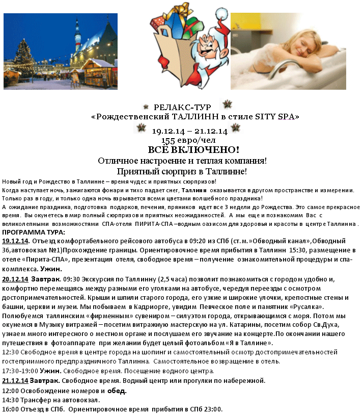 | 01 Дек 2014 | 14:51:21 | ЭСТОНИЯ Таллин 19.12-21.12 Релакс Тур за 155 евро от фирмы АРМИДА |