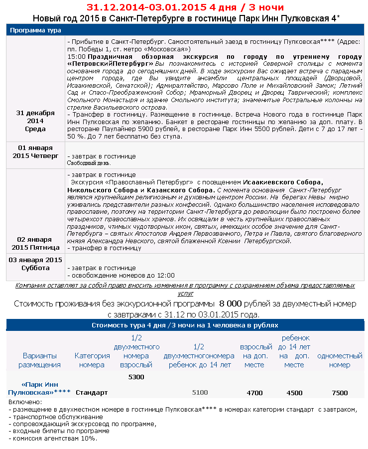 16 Дек 2014 02:31:55 РОССИЯ Санкт-Петербург 31.12-03.01 с разм. в Park Inn Пулковская 4* - на Новый Год от фирмы СТАТУС