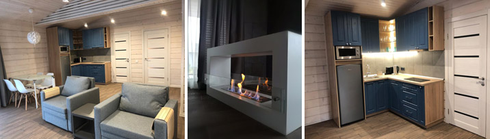оборудованны всем необходимым: камин, зона отдыха-гостинная, открытая